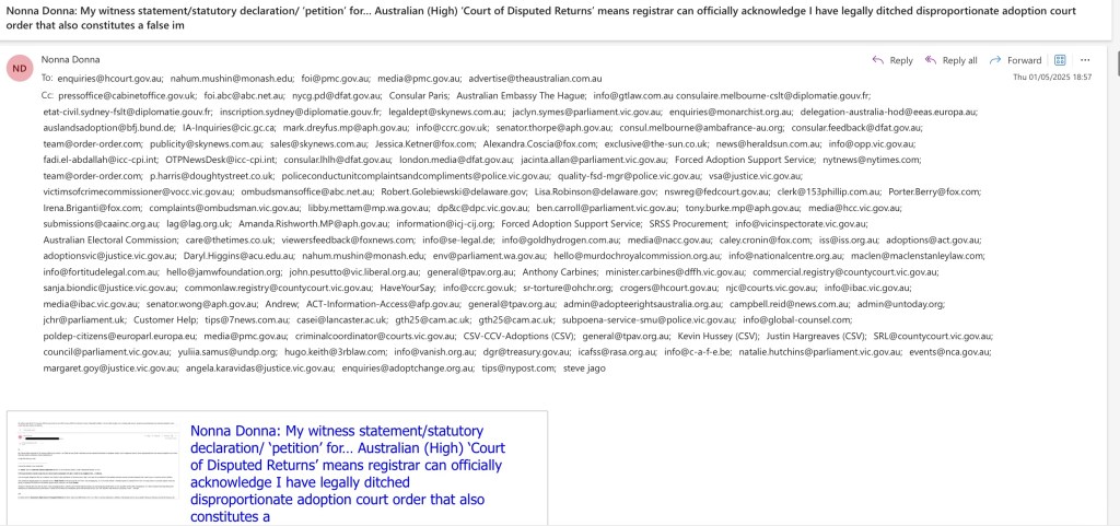 Nonna Donna: My witness statement/statutory declaration/ ‘petition’ for… Australian (High) ‘Court of Disputed Returns’ means registrar can officially acknowledge I have legally ditched disproportionate adoption court order that also constitutes a false imprisonment, through my… British High Court Habeas Corpus Court Order dated 16th April 2008 from Justice Owen, that also includes a multiplicity of UK jury lawsuits because of deceit of Murdoch crime family & Australian politicians towards me in UK, so Australian politicians et al are legally obliged to also settle those, that will all mean I am free to stand in national & federal elections in Australia &… elsewhere; it is my choice whether or not I ditch any dual nationalities I was born with or acquired through adoption, marriage, or naturalisation in Australia or elsewhere (01/05/2025)