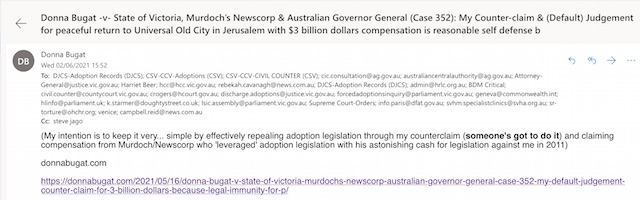 Donna Bugat -v- State of Victoria, Murdoch’s Newscorp & Australian Governor General (Case 352): My Counter-claim & (Default) Judgement for peaceful return to Universal Old City in Jerusalem with $3 billion dollars compensation is reasonable self defense because there is no political, religious or royal ‘discretionary’ power incl. of any court, to use adoption to (in part or whole) erase any identity incl. DNA (26.03.2010)