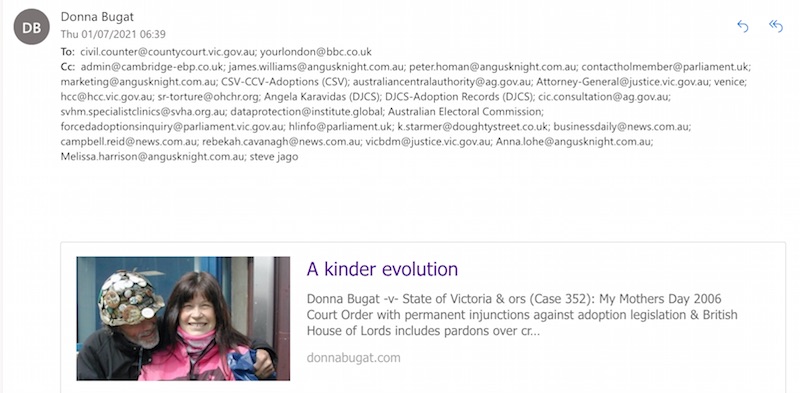 Donna Bugat -v- State of Victoria & ors (Case 352): My Mothers Day 2006 Court Order with permanent injunctions against adoption legislation & British House of Lords includes pardons over criminal prosecutions because it is more important to have sustainable change for a kinder future for everyone (01.07.2021)