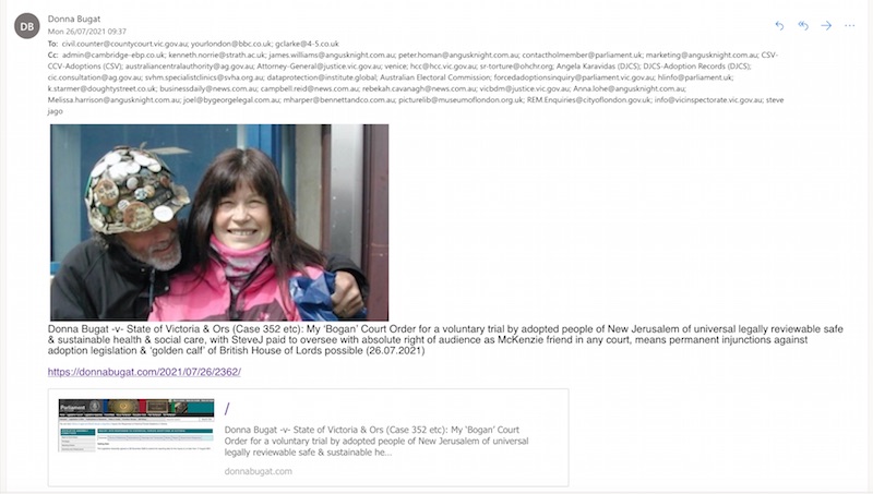 Donna Bugat -v- State of Victoria & Ors (Case 352 etc): My ‘Bogan’ Court Order for a voluntary trial by adopted people of New Jerusalem of universal legally reviewable safe & sustainable health & social care, with SteveJ paid to oversee with absolute right of audience as McKenzie friend in any court, means permanent injunctions against adoption legislation & ‘golden calf’ of British House of Lords possible (26.07.2021)