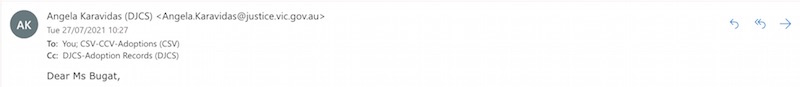 I am now looking into proceeding with ex-parte permanent injunctions against adoption…. legislation, … in another state, with additional costs payable by the State of Victoria, that includes your department. This is because there is a ‘bewildering’ lack of acknowledgement that due process 101 that (presumably) applies in all other court cases, cannot simply be replaced by any old… legislation, in… adoption cases.
