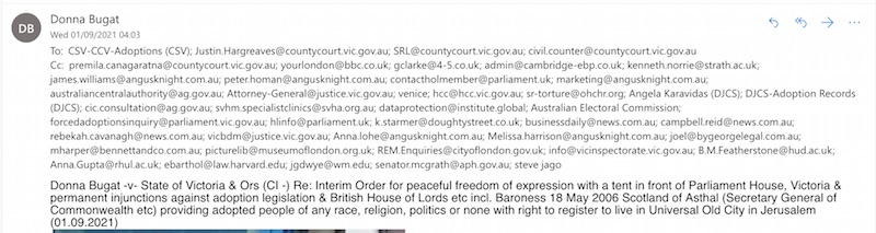 Donna Bugat -v- State of Victoria & Ors (CI -) Re: Interim Order for peaceful freedom of expression with a tent in front of Parliament House, Victoria & permanent injunctions against adoption legislation & British House of Lords etc incl. Baroness 18 May 2006 Scotland of Asthal (Secretary General of Commonwealth etc) providing adopted people of any race, religion, politics or none with right to register to live in Universal Old City in Jerusalem (01.09.2021)