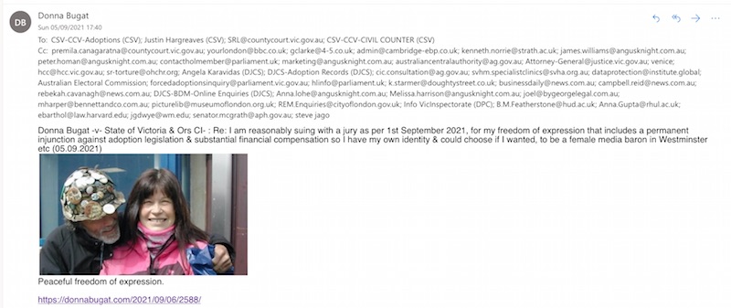 Donna Bugat -v- State of Victoria & Ors CI- : Re: I am reasonably suing with a jury as per 1st September 2021, for my freedom of expression that includes a permanent injunction against adoption legislation & substantial financial compensation so I have my own identity & could choose if I wanted, to be a female media baron in Westminster etc (05.09.2021)
