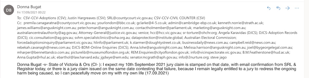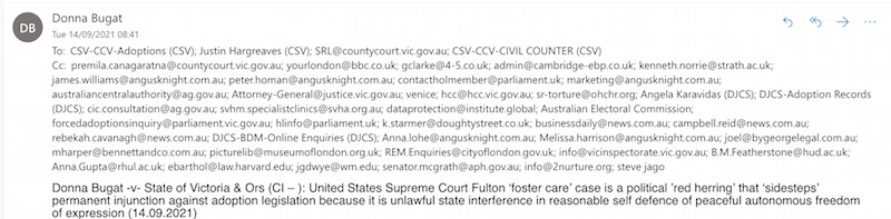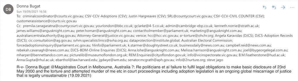 Donna Bugat -v- State of Victoria & Ors: Re: A mandatory public health order the unlawful state interference involving the torture & attempted murder of me because I reject adoption is recorded so I can claim compensation & a permanent injunction against adoption legislation & peacefully move on with my own life (10.09.2021)