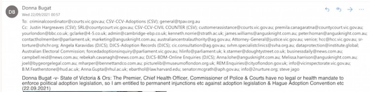 Donna Bugat -v- State of Victoria & Ors: The Premier, Chief Health Officer, Commissioner of Police & Courts have no legal or health mandate to enforce political adoption legislation, so I am entitled to permanent injunctions etc against adoption legislation & Hague Adoption Convention etc (22.09.2021)