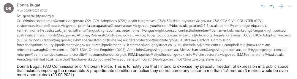 Donna Bugat: FAO Commissioner of Victorian Police. This is to notify you that I intend to exercise my peaceful freedom of expression in a public space, that includes imposing the reasonable & proportionate condition on police they do not come any closer to me than 1.5 metres (3 metres would be even more appreciated) (20.09.2021)