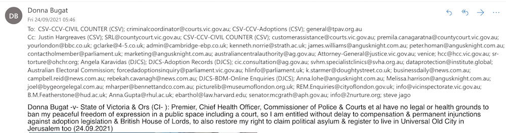 Donna Bugat -v- State of Victoria & Ors (CI- ): Premier, Chief Health Officer, Commissioner of Police & Courts et al have no legal or health grounds to ban my peaceful freedom of expression in a public space including a court, so I am entitled without delay to compensation & permanent injunctions against adoption legislation & British House of Lords, to also restore my right to claim political asylum & register to live in Universal Old City in Jerusalem too (24.09.2021)