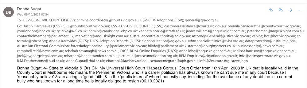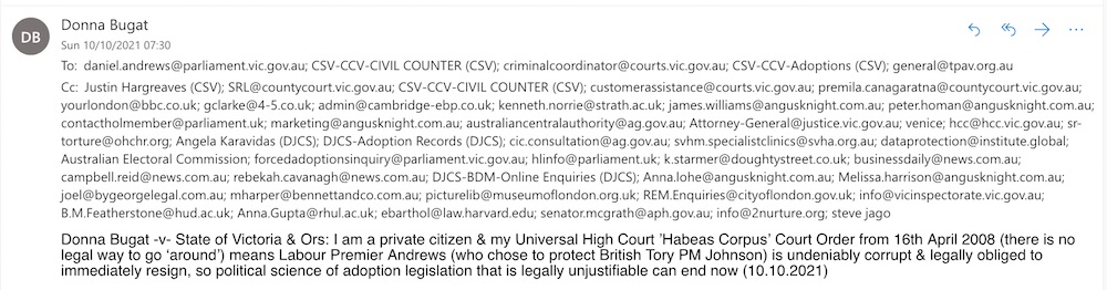Donna Bugat -v- State of Victoria & Ors: I am a private citizen & my Universal High Court ’Habeas Corpus’ Court Order from 16th April 2008 (there is no legal way to go ‘around’) means Labour Premier Andrews (who chose to protect British Tory PM Johnson) is undeniably corrupt & legally obliged to immediately resign, so political science of adoption legislation that is legally unjustifiable can end now (10.10.2021)