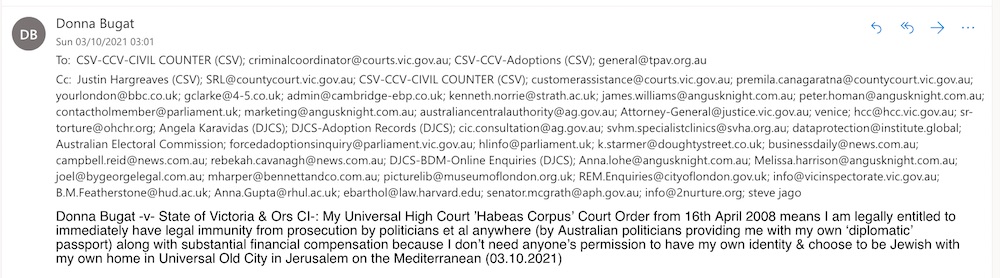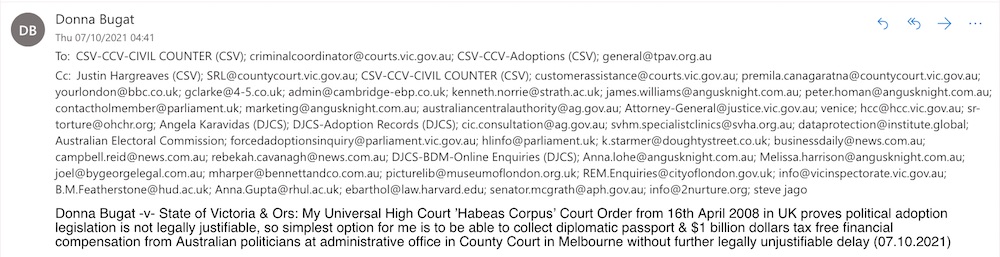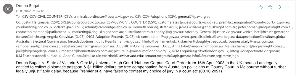 Donna Bugat -v- State of Victoria & Ors: My Universal High Court ’Habeas Corpus’ Court Order from 16th April 2008 in UK proves political adoption legislation is not legally justifiable, so simplest option for me is to be able to collect diplomatic passport & $1 billion dollars tax free financial compensation from Australian politicians at administrative office in County Court in Melbourne without further legally unjustifiable delay (07.10.2021)