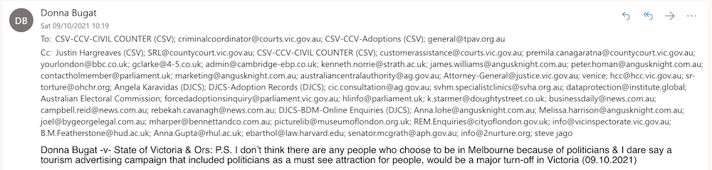 Donna Bugat -v- State of Victoria & Ors: P.S. I don’t think there are any people who choose to be in Melbourne because of politicians & I dare say a tourism advertising campaign that included politicians as a must see attraction for people, would be a major turn-off in Victoria (09.10.2021)