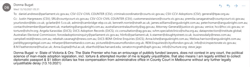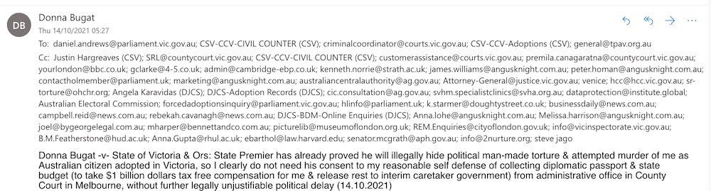Donna Bugat -v- State of Victoria & Ors: The political torture & attempted murder etc of me happened because wholly unnecessary adoption legislation is legally unenforceable, so I am legally entitled to reasonable & proportionate alternative of legally enforceable out of court settlement with diplomatic passport in my own identity of Donna Bugat & $1 billion dollars tax free compensation, without further legally unjustifiable political delay (16.10.2021)