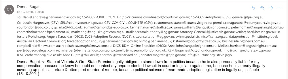 Donna Bugat -v- State of Victoria & Ors: State Premier legally obliged to stand down from politics because he is also personally liable for my compensation, because he knew he could not contest my unprecedented lawsuit in court or legislate against me, because he is already illegally covering up political torture & attempted murder of me etc, because political science of man-made adoption legislation is legally unjustifiable (15.10.2021)