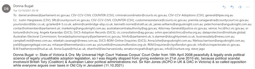 Donna Bugat -v- State of Victoria & Ors: My Universal High Court ‘Habeas Corpus’ Court Order from 16th April 2008 peacefully & legally ends political science of legally unjustifiable adoption legislation, so I was illegally stopped from giving evidence on 21st June 2010 etc, because political scandal involves/d British Tory (Coalition) & Australian Labor political administrations incl. Sir Ken Jones (ACPO in UK & DAC in Victoria) & so called opposition while everyone argues over taxes in Old City in Jerusalem (11.10.2021)
