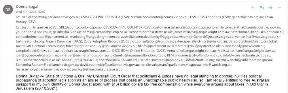 Donna Bugat -v- State of Victoria & Ors: My Universal Court Order that politicians & judges have no legal standing to oppose, nullifies political propaganda of adoption legislation as an abuse of process that poses an unacceptable public health risk, so I am legally entitled to free Australian passport in my own identity of Donna Bugat along with $1.4 billion dollars tax free compensation while everyone argues about taxes in Old City in Jerusalem (26.10.2021)
