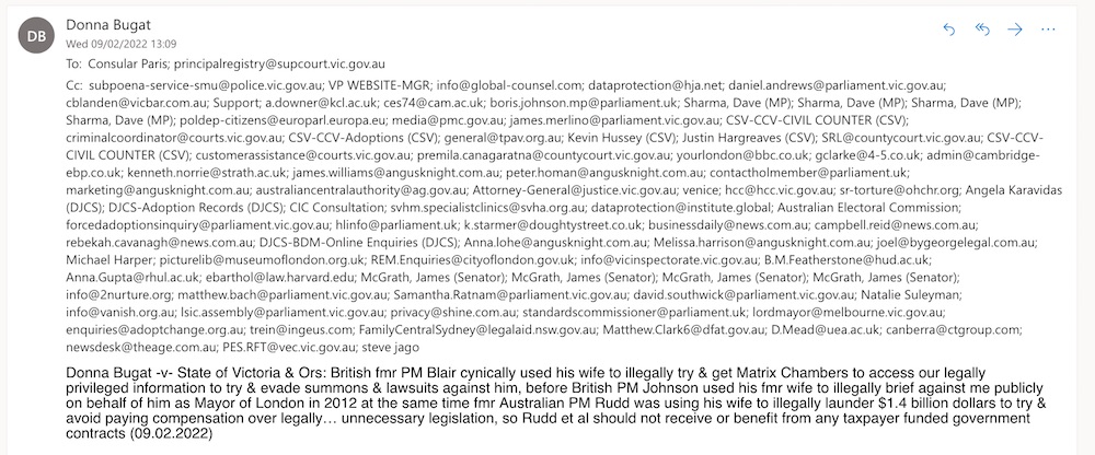 Donna Bugat -v- State of Victoria & Ors: British fmr PM Blair cynically used his wife to illegally try & get Matrix Chambers to access our legally privileged information to try & evade summons & lawsuits against him, before British PM Johnson used his fmr wife to illegally brief against me publicly on behalf of him as Mayor of London in 2012 at the same time fmr Australian PM Rudd was using his wife to illegally launder $1.4 billion dollars to try & avoid paying compensation over legally… unnecessary legislation, so Rudd et al should not receive or benefit from any taxpayer funded government contracts (09.02.2022)