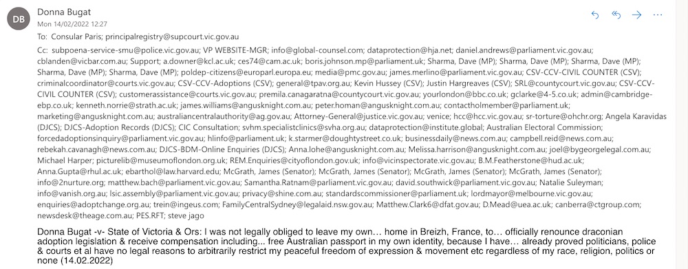 Donna Bugat -v- State of Victoria & Ors: I was not legally obliged to leave my own… home in Breizh, France, to… officially renounce draconian adoption legislation & receive compensation including… free Australian passport in my own identity, because I have… already proved politicians, police & courts et al have no legal reasons to arbitrarily restrict my peaceful freedom of expression & movement etc regardless of my race, religion, politics or none (14.02.2022)