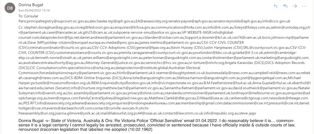 Donna Bugat -v- State of Victoria, Australia & Ors: Re Victoria Police ‘Official Sensitive’ email 01.04.2022. I do reasonably believe it is… common-sense it is a legal certainty I cannot legally be arrested, prosecuted, convicted or sentenced because I have officially inside & outside courts of law, renounced draconian legislation that labelled me adopted (10.02.1962)