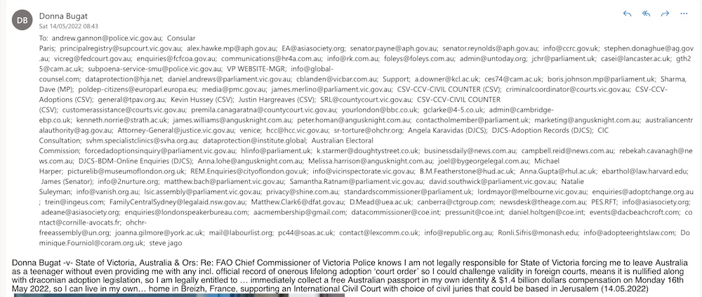 Donna Bugat -v- State of Victoria, Australia & Ors: Re: FAO Chief Commissioner of Victoria Police knows I am not legally responsible for State of Victoria forcing me to leave Australia as a teenager without even providing me with any incl. official record of onerous lifelong adoption ‘court order’ so I could challenge validity in foreign courts, means it is nullified along with draconian adoption legislation, so I am legally entitled to … immediately collect a free Australian passport in my own identity & $1.4 billion dollars compensation on Monday 16th May 2022, so I can live in my own… home in Breizh, France, supporting an International Civil Court with choice of civil juries that could be based in Jerusalem (14.05.2022)