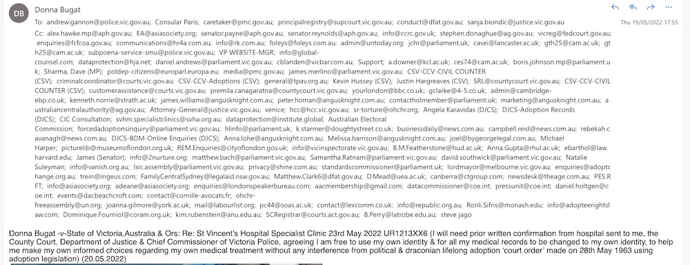 Donna Bugat -v-State of Victoria, Australia & Ors: Re: St Vincent’s Hospital Specialist Clinic 23rd May 2022 UR1213XX6 (I will need prior written confirmation from hospital sent to me, the County Court, Department of Justice & Chief Commissioner of Victoria Police, agreeing I am free to use my own identity & for all my medical records to be changed to my own identity, to help me make my own informed choices regarding my own medical treatment without any interference from political & draconian lifelong adoption ‘court order’ made on 28th May 1963 using adoption legislation) (20.05.2022)