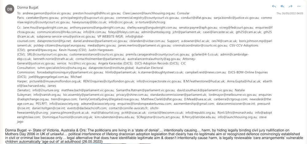 Donna Bugat -v- State of Victoria, Australia & Ors: The politicians are living in a ‘state of denial’… intentionally causing… harm, by hiding legally binding civil jury nullification on Mothers Day 2006 in UK of unlawful… political interference of lifelong draconian adoption legislation that clearly has no legitimate aim or recognized defence convincingly established in civil or criminal law because only… legal alternative that does have identifiable legitimate aim & doesn’t intentionally cause harm, is legally reviewable ‘care arrangements’ vulnerable children automatically ‘age out of’ at adulthood (26.05.2022)