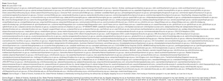 Donna Bugat -v- State of Victoria, Australia & Ors: State Premier Andrews is intentionally harming & punishing me without law, by illegally stopping me as an Australian citizen, from having an Australian passport in my own identity, so I can live in my own home in Breizh, France with compensation after he already didn’t care about actual premeditated political torture & attempted murder of me in the UK etc etc, all because I am an equal & adult when as an adoption refusenik, I say no to draconian adoption legislation (06.06.2022)