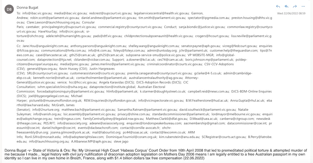 Donna Bugat -v- State of Victoria & Ors: Re: My Universal High Court ‘Habeas Corpus’ Court Order from 16th April 2008 that led to premeditated political torture & attempted murder of me because I made… legal history with civil jury nullification of draconian adoption legislation on Mothers Day 2006 means I am legally entitled to a free Australian passport in my own identity so I can live in my own home in Breizh, France, along with $1.4 billion dollars tax free compensation (22.06.2022)