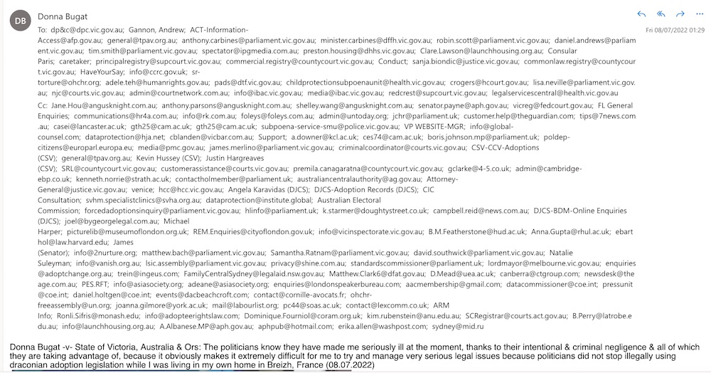 Donna Bugat -v- State of Victoria, Australia & Ors: The politicians know they have made me seriously ill at the moment, thanks to their intentional & criminal negligence & all of which they are taking advantage of, because it obviously makes it extremely difficult for me to try and manage very serious legal issues because politicians did not stop illegally using draconian adoption legislation while I was living in my own home in Breizh, France (08.07.2022)