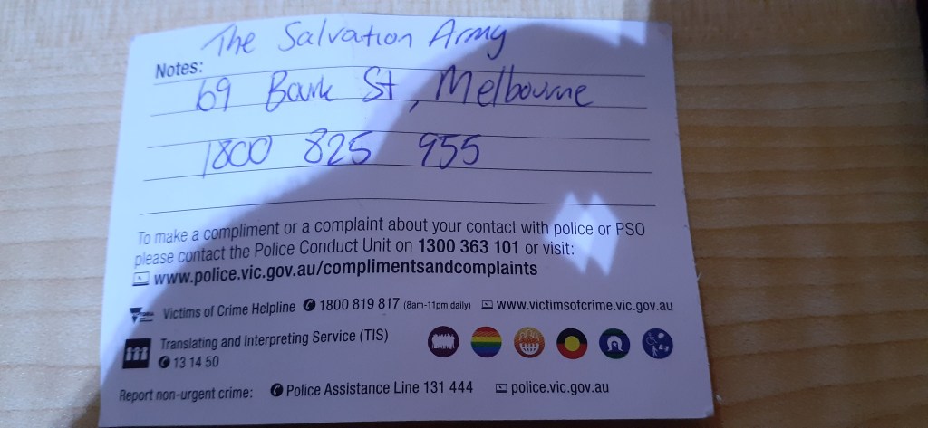 A police officer claimed they are allowed to make a referral for me to have legal aid, which they claimed they were doing, but I do not believe they were doing. I said it really is not for me to run around any longer trying to ‘sort anything out’ (only to be unlawfully arrested in court for goodness sakes) while the buck is endlessly passed between government agencies and departments. When the police tried to fob me off on the Salvation Army, they said they don’t do legal aid and it is the responsibility of the police to run around and try and find me emergency housing ( I reminded everyone about the unused Mickleham quarantine centre that I could come and go from) if the private company do not want me waiting to catch a bus to the airport at the oh so precious Southern Cross Station.