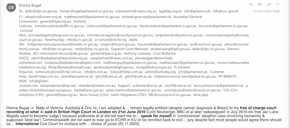 Donna Bugat -v- State of Victoria, Australia & Ors: re: I am adopted &… remain legally entitled (despite cancer diagnosis & Brexit) to my free of charge court recording of what -I- said in British High Court in London on 21st June 2010 (Lord Neuberger, BBC et al later ‘sidestepped’ in July 2010 etc that Jan Luba illegally used to become ‘judge’) because politicians et al did not want me to… speak for myself in ‘controversial’ adoption case (involving monarchy & supposed ‘land law’) Commonwealth did not want to ever go to ECHR in EU or be remitted back to civil… jury despite fact most people would agree there should be… International Civil Court for civilians with… choice of juries (25.11.2022)