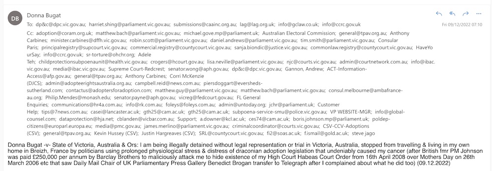 Donna Bugat -v- State of Victoria, Australia & Ors: I am being illegally detained without legal representation or trial in Victoria, Australia, stopped from travelling & living in my own home in Breizh, France by politicians using prolonged physiological stress & distress of draconian adoption legislation that undeniably caused my cancer (after British fmr PM Johnson was paid £250,000 per annum by Barclay Brothers to maliciously attack me to hide existence of my High Court Habeas Court Order from 16th April 2008 over Mothers Day on 26th March 2006 etc that saw Daily Mail Chair of UK Parliamentary Press Gallery Benedict Brogan transfer to Telegraph after I complained about what he did too) (09.12.2022)