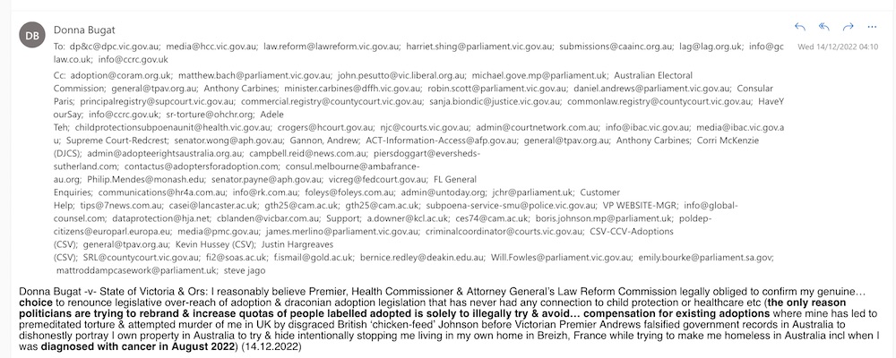 Donna Bugat -v- State of Victoria & Ors: I reasonably believe Premier, Health Commissioner & Attorney General’s Law Reform Commission legally obliged to confirm my genuine… choice to renounce legislative over-reach of adoption & draconian adoption legislation that has never had any connection to child protection or healthcare etc (the only reason politicians are trying to rebrand & increase quotas of people labelled adopted is solely to illegally try & avoid… compensation for existing adoptions where mine has led to premeditated torture & attempted murder of me in UK by disgraced British ‘chicken-feed’ Johnson before Victorian Premier Andrews falsified government records in Australia to dishonestly portray I own property in Australia to try & hide intentionally stopping me living in my own home in Breizh, France while trying to make me homeless in Australia incl when I was diagnosed with cancer in August 2022) (14.12.2022)
