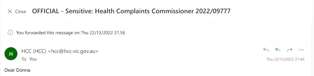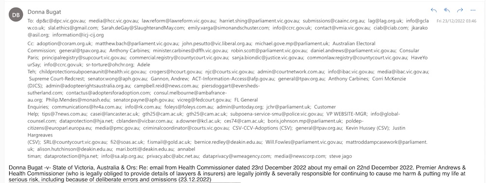 Donna Bugat -v- State of Victoria, Australia & Ors: Re: email from Health Commissioner dated 23rd December 2022 about my email on 22nd December 2022. Premier Andrews & Health Commissioner (who is legally obliged to provide details of lawyers & insurers) are legally jointly & severally responsible for continuing to cause me harm & putting my life at serious risk, including because of deliberate errors and omissions (23.12.2022)