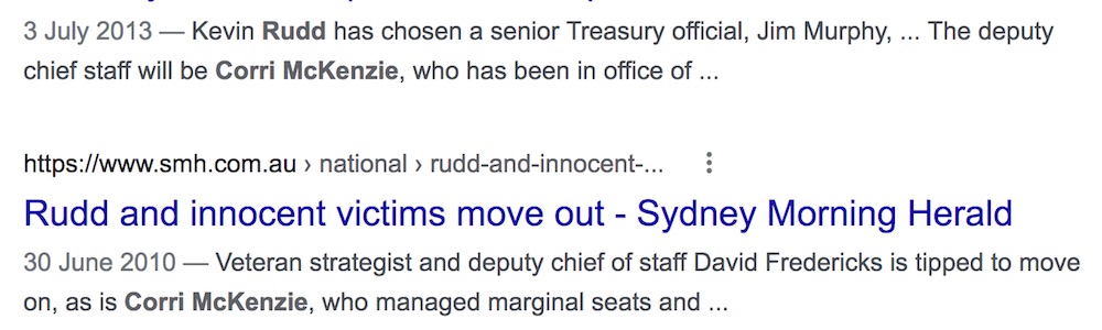 N.B: I would guess the fmr Australian PM Rudd’s not so innocent, former ‘media adviser’ called Ms McKenzie (below) who spun herself into a financially lucrative ‘role’ that could only be called a clearly… political appointment at the DOJ in Victoria, of which the ‘Adoption Information Service’ became a part of) has planned to hook up with Rudd again.