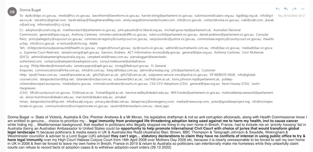 Donna Bugat -v- State of Victoria, Australia & Ors: Premier Andrews & a Mr Moran, his legislative draftsman & not so anti corruption aficionado, along with Health Commissioner know I am entitled to genuine… choice to prioritize my… legal immunity from prolonged life threatening adoption being used against me to harm my health, incl to cause cancer while hiding my… Mediterranean background, that resulted in politicians who illegally stopped me living in my own home in Breizh, France, had to include me on ‘priority housing’ list in Australia (being an Australian Ambassador to United States which comes with a house, albeit not as beautiful as my own home, could be opportunity to help promote International Civil Court with choice of juries that would transform global legal landscape !!) because politicians & media execs in UK & Australia like Rudd (Australia) Blair, Brown, BBC Thompson & Telegraph Johnson & Swaddle, Wokingham & Westminster councillor & adviser to a Lord Sugar (UK) advised they can’t sign… statutory declarations to claim they have no conflicts of interest in using public office to try & have legal immunity over my High Court Habeas Corpus Court Order from 16th April 2008 over Mothers Day 2006 etc, because it is clearly unreasonable to be forced to sell my own home in UK in 2006 & then be forced to leave my own home in Breizh, France in 2019 & return to Australia so politicians can intentionally make me homeless while they unlawfully claim courts can refuse to record facts of adoption cases & to withdraw adoption court orders (29.12.2022)