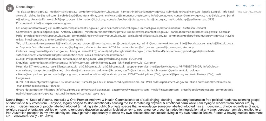 Donna Bugat -v- State of Victoria, Australia & Ors: Premier Andrews & Health Commissioner et al’s all singing, dancing… statutory declaration free political roadshow spinning gospel of adoption to buy votes from… anyone, legally obliged to stop intentionally causing me life threatening physical & emotional harm while I am trying to recover from cancer etc, by ending… discrimination of people labelled adopted & making safe public & private spaces that acknowledge someone labelled adopted has a… genuine… choice regardless of race, religion, sexual orientation, politics or none, to renounce draconian adoption legislation -or- to not renounce draconian adoption legislation, at any time, because I am also entitled to a free Australian passport in my own identity so I have genuine opportunity to make my own choices that can include living in my own home in Breizh, France & having medical treatment etc… elsewhere too (12.01.2023)
