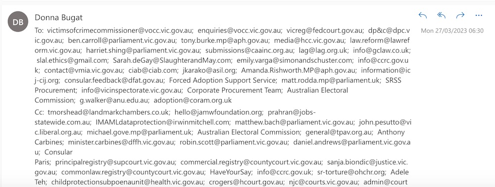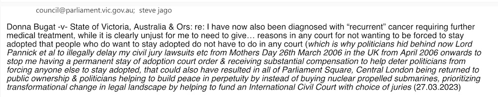 Donna Bugat -v- State of Victoria, Australia & Ors: re: I have now also been diagnosed with “recurrent” cancer requiring further medical treatment, while it is clearly unjust for me to need to give… reasons in any court for not wanting to be forced to stay adopted that people who do want to stay adopted do not have to do in any court (which is why politicians hid behind now Lord Pannick et al to illegally delay my civil jury lawsuits etc from Mothers Day 26th March 2006 in the UK from April 2006 onwards to stop me having a permanent stay of adoption court order & receiving substantial compensation to help deter politicians from forcing anyone else to stay adopted, that could also have resulted in all of Parliament Square, Central London being returned to public ownership & politicians helping to build peace in perpetuity by instead of buying nuclear propelled submarines, prioritizing transformational change in legal landscape by helping to fund an International Civil Court with choice of juries (27.03.2023)