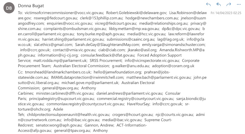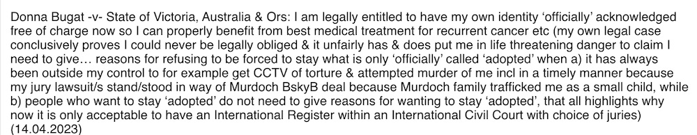 Donna Bugat -v- State of Victoria, Australia & Ors: I am legally entitled to have my own identity ‘officially’ acknowledged free of charge now so I can properly benefit from best medical treatment for recurrent cancer etc (my own legal case conclusively proves I could never be legally obliged & it unfairly has & does put me in life threatening danger to claim I need to give… reasons for refusing to be forced to stay what is only ‘officially’ called ‘adopted’ when a) it has always been outside my control to for example get CCTV of torture & attempted murder of me incl in a timely manner because my jury lawsuit/s stand/stood in way of Murdoch BskyB deal because Murdoch family trafficked me as a small child, while b) people who want to stay ‘adopted’ do not need to give reasons for wanting to stay ‘adopted’, that all highlights why now it is only acceptable to have an International Register within an International Civil Court with choice of juries) (14.04.2023)