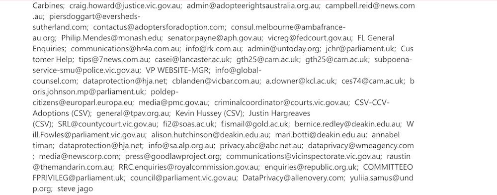 The Victorian Victims of Crime Commissioner is legally obliged to put my witness statement on the court record because the adoption order is “void ab initio” because it is and has been outside my control and has only continued to put me in danger, to produce the CCTV of the torture and attempted murder of me, including in a timely manner, because I was trafficked by the Murdoch family as a small child. The fact the CCTV of the torture and attempted murder of me, was not given to me, including in a timely manner, which could have been done by email does of itself constitute a criminal offence, because it was always my decision what to do with that CCTV that should never have in any event been in the hands of someone who was known to repeatedly threaten me and cause me actual harm.