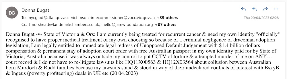 Donna Bugat -v- State of Victoria, Australia & Ors: I am currently being treated for recurrent cancer & need my own identity “officially” recognised to have proper medical treatment of my own choosing so because of… criminal negligence of draconian adoption legislation I am legally entitled to immediate legal redress of Unopposed Default Judgemrnt with $1.4 billion dollars compensation & permanent stay of adoption court order with free Australian passport in my own identity paid for by state of Victoria, Australia because it was always outside my control to put CCTV of torture & attempted murder of me on ANY… court record & I do not need to re-litigate lawsuits like HQ11X00563 & HQ12X03564 about collusion between Australian born Murdoch & Rudd families because my lawsuits stand & stood in way of their undeclared conflicts of interest with BskyB & Ingeus (poverty profiteering) deals in UK etc (20.04.2023)
