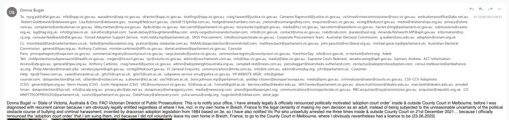 Donna Bugat -v- State of Victoria, Australia & Ors: FAO Victorian Director of Public Prosecutions: This is to notify your office, I have already legally & officially renounced politically motivated ‘adoption court order’ inside & outside County Court in Melbourne, before I was diagnosed with recurrent cancer because I am obviously legally entitled regardless of where I live, incl. in my own home in Breizh, France to the legal certainty of making my own decision as an adult, instead of being subjected to the unreasonable uncertainty of the political obstacle course of bullying and criminal harassment, invented by draconian adoption legislation from 1984 based on me, so I have also notified Vic Pol who unlawfully arrested me three times inside & outside County Court on 21st December 2021… because I officially renounced the ‘adoption court order’ that I am suing them, incl because I did not voluntarily leave my own home in Breizh, France, to go to the County Court in Melbourne, where I obviously nevertheless had a licence to be (23.06.2023)
