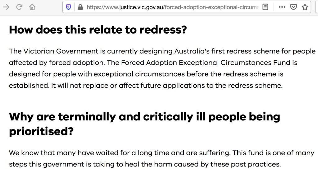 The politicians are obviously also intentionally causing a lot of emotional damage, with the government only funding organisations who are trying to victim blame the adopted person because no government funded organisation in Melbourne has ever been able to explain to me, let alone rationally why I should have had to… return to Melbourne and… go to the County Court and no organisation taking government funding ever offered to accompany me to the County Court because it is obviously so unreasonable to for example make someone living overseas return to Melbourne as part of a seriously unreasonable obstacle course that has not even handed over the most basic disclosure of an official court extract from the court register, which is quite different from cherry picked photocopies from the AIS. It is a matter of fact the people running the agencies who accept government funding in Australia based on the political language of ‘forced adoptions’ completely ignore the problems the 1984 legislation causes for someone like me who was living overseas. No one in the agencies getting government funding has considered how disproportionate it is that I was forced to return to the state of origin and be homeless, to try and sort out the mess caused by the unlawful ‘adoption court order’ to my life. The fact that I was then homeless during a global pandemic, when I was still stopped from living in my own home, didn’t bother any government agency.