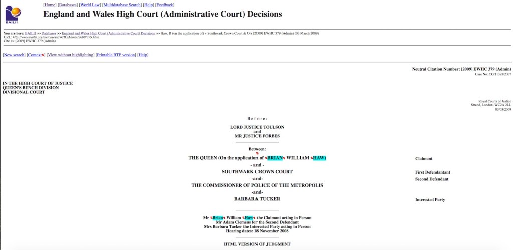 This case (that had not been concluded before or after Johnson’s extravaganza in 2010 including because a Southwark Crown Court was trying to avoid handing over a court transcript or recording to Brian and I) where I was an ‘interested party’ but entitled to a civil jury because I was unlawfully arrested, showed… an earlier case…