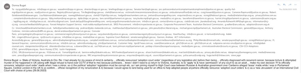 Donna Bugat -v- State of Victoria, Australia & Ors: Re: I had already for my peace of mind & certainty… officially renounced ‘adoption court order’ (regardless of any legislation etc) before then being… officially diagnosed with recurrent cancer, because torture & attempted murder of me happened in UK (along with illegal refusal to hand over CCTV of that to me) because politicians… knew I didn’t need to a) return to Victoria, Australia, to b) ‘apply’ to & have ‘permission’ of any court to as an adult… make my own decision !!!! to officially renounce ‘adoption court order’ made when I was a minor, so c) the political ‘adoption’ legislation must be corrupt etc, so I am joining myself to High Court case between Russian & Australian government over Canberra alleged ’lease’ made while I was in Parliament Square, Central London in the UK to a) confirm… official recognition of my renunciation & b) because I would agree to land being used for an office to help adopted people anywhere officially renounce ‘adoption court orders’ & c) as a ‘new Jerusalem’ of an International Civil Court with choice of juries (29.06.2023)