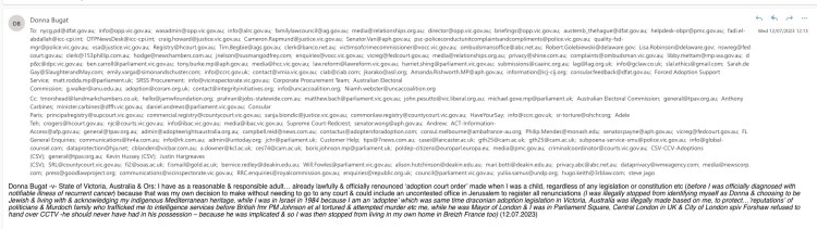 Donna Bugat -v- State of Victoria, Australia & Ors: I have as a reasonable & responsible adult… already lawfully & officially renounced ‘adoption court order’ made when I was a child, regardless of any legislation or constitution etc (before I was officially diagnosed with notifiable illness of recurrent cancer) because that was my own decision to make without needing to go to any court & could include an uncontested office in Jerusalem to register all renunciations (I was illegally stopped from identifying myself as Donna & choosing to be Jewish & living with & acknowledging my indigenous Mediterranean heritage, while I was in Israel in 1984 because I am an ‘adoptee’ which was same time draconian adoption legislation in Victoria, Australia was illegally made based on me, to protect…’reputations’ of politicians & Murdoch family who trafficked me to intelligence services before British fmr PM Johnson et al tortured & attempted murder etc me, while he was Mayor of London & I was in Parliament Square, Central London in UK & City of London spiv Forshaw refused to hand over CCTV -he should never have had in his possession – because he was implicated & so I was then stopped from living in my own home in Breizh France too) (12.07.2023)