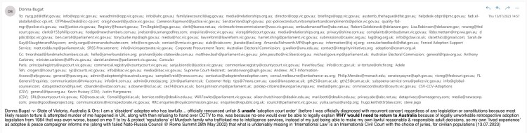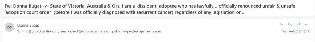 Donna Bugat -v- State of Victoria, Australia & Ors: I am a ‘dissident’ adoptee who has lawfully… officially renounced unfair & unsafe ’adoption court order’ (before I was officially diagnosed with recurrent cancer) regardless of any legislation or constitutions because most likely reason torture & attempted murder of me happened in UK, along with then refusing to hand over CCTV to me, was because no-one would ever be able to legally explain WHY would I need to return to Australia because of legally unworkable retrospective adoption legislation from 1984 that was even worse, based on me !! to try & protect ‘reputations’ of Murdoch family who trafficked me to intelligence services, instead of my just being able to make my own lawful reasonable & responsible adult decisions, so my own ‘lived experience’ as adoptee & peace campaigner informs me (along with failed Nato-Russia Council @ Rome Summit 28th May 2002) that what is undeniably missing in ‘International Law’ is an International Civil Court with the choice of juries, for civilian populations (13.07.2023)