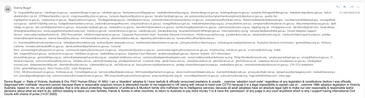 Donna Bugat -v- State of Victoria, Australia & Ors: FAO ‘Human Ethics’ @ ANU: I am a ‘dissident’ adoptee & I have lawfully & officially renounced predatory & unsafe… coercive ‘adoption court order’ regardless of any legislation & constitutions (before I was officially diagnosed with ‘notifiable’ recurrent cancer) because there is reasonable suspicion torture & attempted murder of me happened in UK (along with refusal to hand over CCTV) because it is a legal impossibility to explain use of… coercive 1984 adoption legislation in Victoria, Australia, based on me, on any adult adoptee, that is only about protecting ‘reputations’ of politicians & Murdoch family who trafficked me to intelligence services, because all adult adoptees have an absolute legal right to make our own reasonable & responsible lawful decisions about what we want to do, without needing to leave our own families, friends & homes in other countries, to return to Australia to pay more money !! to & have the ‘permission’ of any judge in any court anywhere which is why I support having International Civil Courts with choice of juries (14.07.2023)
