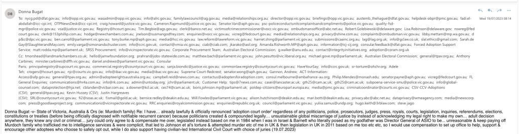 Donna Bugat -v- State of Victoria, Australia & Ors (ie: Murdoch family) Re: I have… already lawfully & officially renounced ‘adoption court order’ regardless of any politicians, police, prosecutors, judges, press, royals, courts, legislation, inquiries, referendums, elections, constitutions or treaties (before being officially diagnosed with notifiable recurrent cancer) because politicians created & compounded legally… unsustainable global miscarriage of justice by instead of acknowledging my legal right to make my own… adult decision anywhere, they knew any civil or criminal… jury could only agree to & compensate me over, legislated instead based on me in 1984 when I was in Israel & Barnett who literally posed as my godfather was Director General of ASIO to be… unreasonable & keep paying off Murdoch family who trafficked me to intelligence services & were complicit, that led to Johnson et al’s torture & attempted murder etc of me in UK & then legislation in UK in 2011 based on me too etc etc, so I would use compensation to set up office to help, support & encourage other adoptees who choose to safely opt out, while I do also support having civilian-led International Civil Court with choice of juries (19.07.2023)