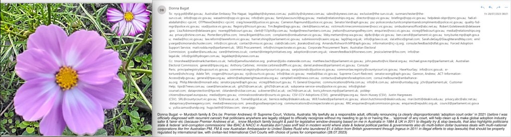 Donna Bugat -v- Murdoch family & Ors (ie: Premier Andrews) @ Supreme Court, Victoria, Australia: My lawfully as a responsible adult, officially renouncing (a clearly disproportionate) ‘adoption court order’ in 2021 (before I was officially diagnosed with recurrent cancer) that politicians anywhere are legally obliged to officially recognize without my needing to go to or having the… ‘approval’ of any court, will help clean up & make global adoption industry safer & fairer etc (because Premier Andrews et al… know Murdoch family bought & paid for legislative window-dressing based on me in Australia in 1984 & UK in 2011 to illegally try & stop lawsuits, that also highlights politicians state & federal ‘anti-corruption commissions’ like IBAC & NACC in Australia don’t pass sniff test in modern world where state & federal political parties & governments also do multi-billion dollar business deals with multi-national corporations like fmr Australian PM, FM & now Australian Ambassador to United States Rudd who laundered $1.4 billion from British government through Ingeus in 2011 in illegal efforts to stop lawsuits) that should be properly regulated by international law, with civilian-led International Civil Courts with choice of juries for compensation (28.07.2023)