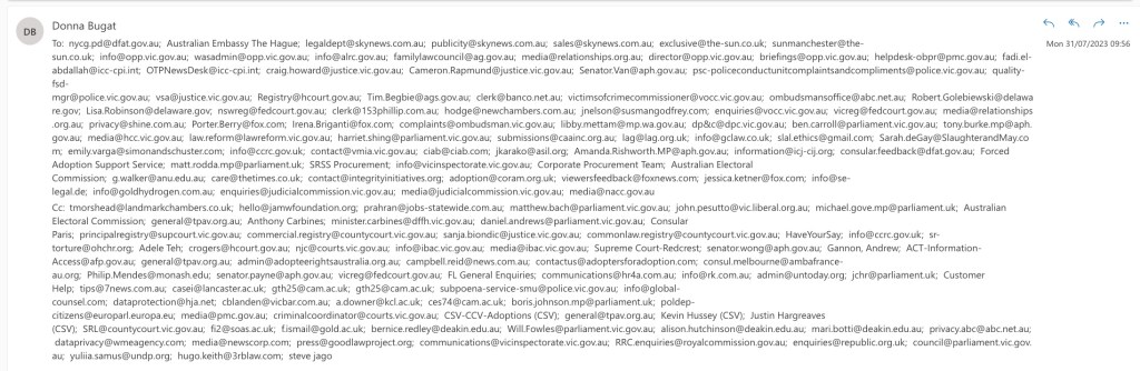 Donna Bugat -v- Murdoch family & Ors (ie: Premier Andrews) @ Supreme Court, Victoria, Australia: My officially renouncing ‘adoption court order’ (made while I was a minor) is… intended to make adoptions, safer, fairer &… legal, for everyone & could not possibly have legally needed me to return to Victoria, Australia to go to & have ‘approval’ of any court to do (before I was then officially diagnosed with recurrent cancer) that includes County Court was however… legally obliged to file my renunciation in my witness statement on 21st December 2021, in Case 352, regardless of whether anyone agreed with me, or not, where there was also no legal authority to exclude the inconvenient fact of torture & attempted murder of me in the UK by the Murdoch family & Johnson et al because of 1984 adoption legislation based on me, in Victoria, Australia, which has only ever been about illegally trying to ‘sidestep’ potential & actual lawsuits in for example Victoria, Australia & then UK (ie: HQ11X00563) while Premier Andrews is still illegally trying to ‘sidestep’ he is legally obliged to officially acknowledge & accept I have lawfully officially renounced ‘adoption court order‘ that he could not legally change I have done, after I returned in July 2019 and he appointed for… political reasons a member of same Cain family who passed… political ‘adoption’ legislation based on me in 1984 bought & paid for by same Murdoch family who had maliciously targeted me in the UK, as a County Court judge, State Coroner & member of Judicial Commission in Melbourne, Victoria in October 2019 (before Cain snr who was… fmr Premier responsible for 1984 legislation died in December 2019) when reality is, Murdoch family have most profited from… 1984 legislation in Australia & 2011 legislation in UK based on me, that is undeniably only illegally intended to ’sidestep’ any potential & actual lawsuits like in UK (ie HQ11X00563 etc) at the long-standing personal, physical & emotional expense of adult adoptees who have illegally been denied the most basic legal right because it was cheaper to keep paying off Murdoch family et al (31.07.2023)