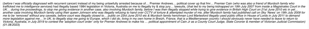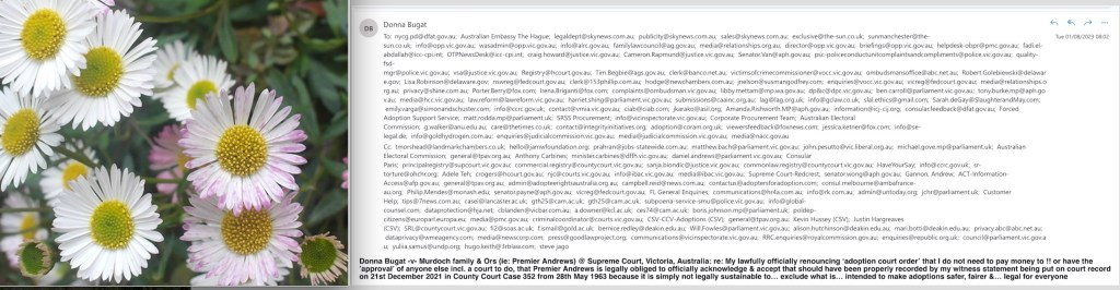 Donna Bugat -v- Murdoch family & Ors (ie: Premier Andrews) @ Supreme Court, Victoria, Australia: re: My lawfully officially renouncing ‘adoption court order’ that I do not need to pay money to !! or have the ’approval’ of anyone else incl. a court to do, that Premier Andrews is legally obliged to officially acknowledge & accept that should have been properly recorded by my witness statement being put on court record on 21st December 2021 in County Court Case 352 from 28th May 1963 because it is simply not legally sustainable to… exclude what is… intended to make adoptions safer, fairer &… legal for everyone (before I was officially diagnosed with recurrent cancer) instead of my being unlawfully arrested because of… Premier Andrews… political cover up that fmr… Premier Cain (who was also a friend of Murdoch family who trafficked me to intelligence services) had illegally based 1984 legislation in Victoria, Australia on me to illegally try & stop jury… lawsuits, (that led to my being kidnapped on 19th July 2007 from inside a Magistrates Court in the UK… during live proceedings, to stop me giving evidence in another case, also involving Murdoch family, before I was then illegally stopped while trying to give evidence in British High Court on 21st June 2010 etc in yet… another case involving Murdoch family using their queen Johnson who was illegally refusing to hand over CCTV of torture & attempted murder of me, after Murdoch family had published call on Sky ‘News’ on 19th July 2009 for me to be ‘removed’ without any caveats, before court was illegally closed to… public on 23rd June 2010 etc & Murdoch family henchman Lord Marlesford illegally used public office in House of Lords in July 2011 to demand more legislation against me… in UK, to illegally stop me going to Europe, which I did do, living in my own home in Breizh, France, that is a Mediterranean country I should obviously never have needed to leave to return to Victoria, Australia, in July 2019 to contest the ‘adoption court order’ only for Premier Andrews to make his … political appointment of Cain Jr as a County Court Judge, State Coroner & member of Victorian Judicial Commission) (01.08.2023)